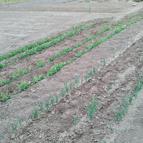 En place 2 routes d'oignons 1 route d'échalote 2 routes de petit pois repiquage de pieds de courges et potimarrons