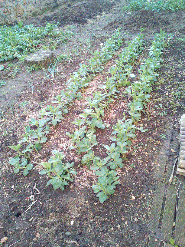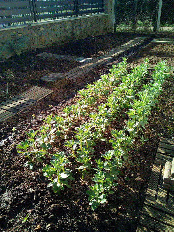 Finalement pas la peine d'attendre ce soir, on le voit sur cette photo des fèves le petit tapis vert en haut à droite c'est des salades.