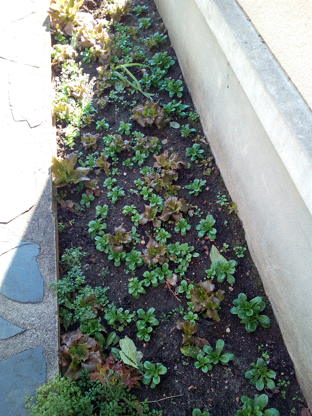 Les mâches continuent de pousser avec ce beau temps. Celles de droites, que j'avais semées en godets, sont les plus belles.