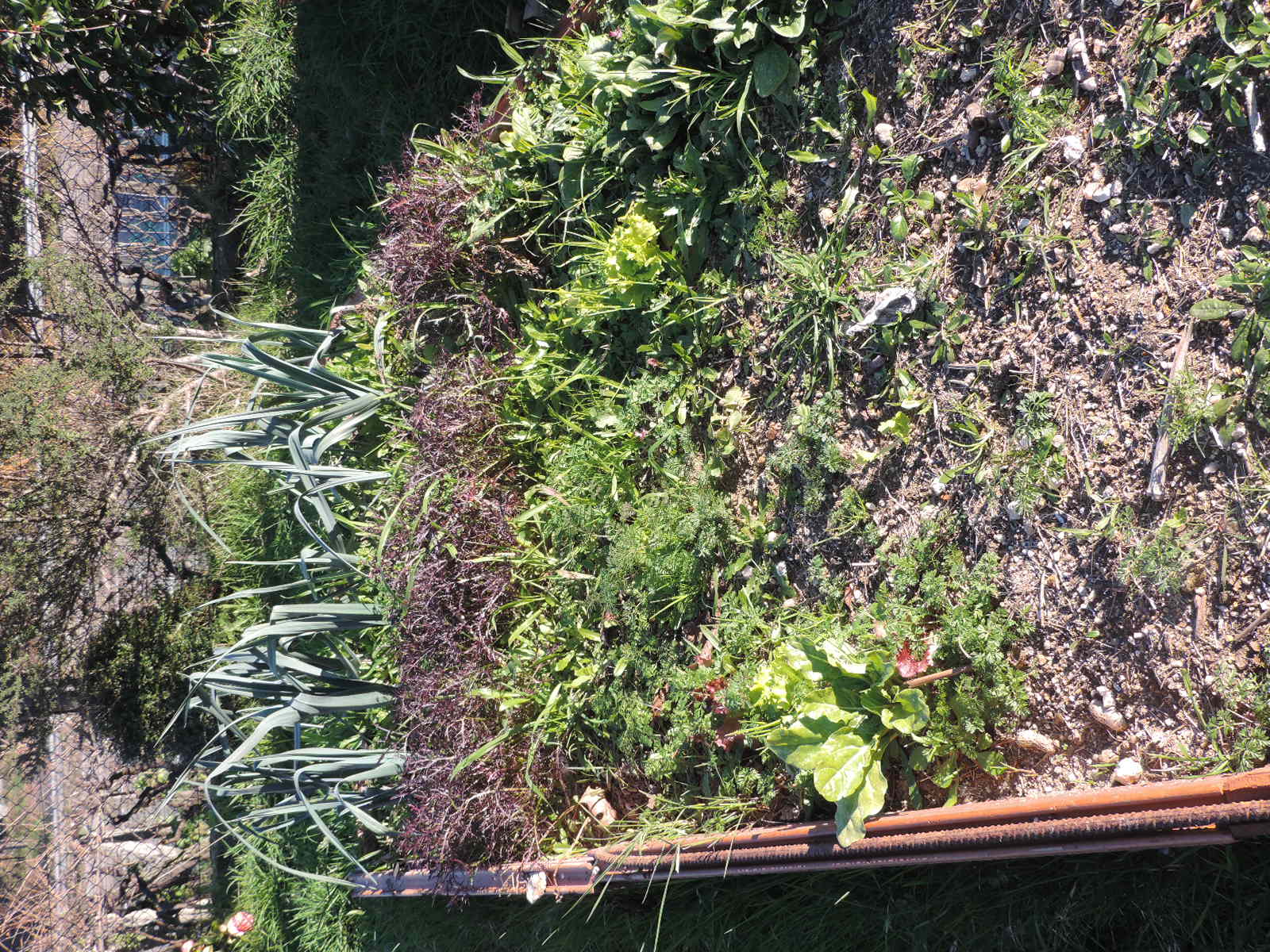 pour le moment, de gauche a droite, nous avons des pois gourmands sur le 1º rectangle ainsi que la phacelie qui pousse mal ds le 2º de la moutarde ds le 3º, un joyeux mélange, vous voyez des carottes, une blette, de la mizuna, des salades, des poireaux... j'ai beau dire que je vais être plus ordonné, ça finit toujours en beau mélange...