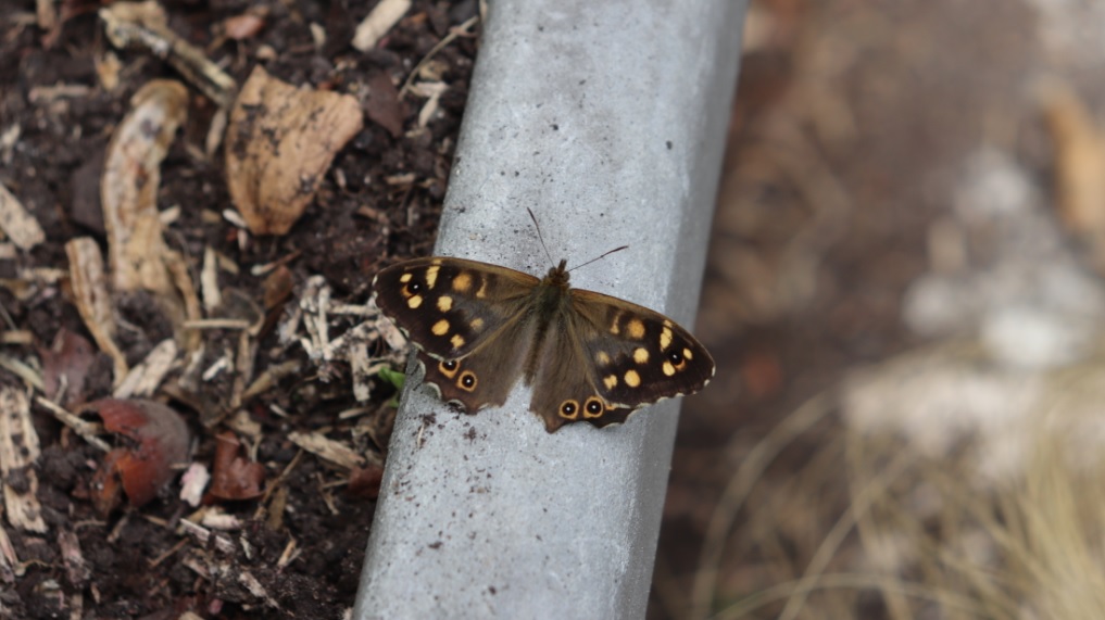 Pararge aegeria, un Tircis mâle, est venu se reposer quelques secondes pas loin d'une poacée :