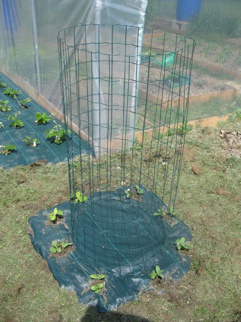 Pour mon bricolage, j'utilise un morceau de grillage de 1 m 20 de hauteur, je fais un cylindre de 60 cm de diamètre, grâce à cela, ce ça me permet de mettre huit pieds de concombres autour, je fais grimper autour du grillage, donc le gain de place et en plus les concombres ne traînent pas sur le sol.