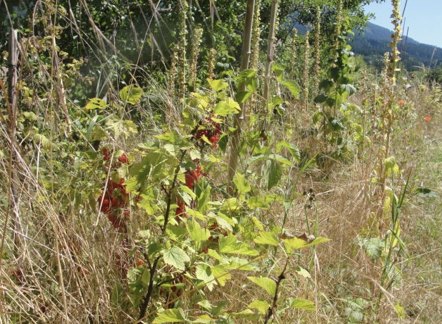 Il reste maintenant les arbustes de la culture sauvage. Noyés dans les herbes folles et les fleurs sauvages, mélangés aux autres petits fruits (cassis, framboisiers, mûres, ...) vivant de l'air du temps et de l'eau des rares pluies, ils vont être cueillis petit à petit pour consommation en frais.