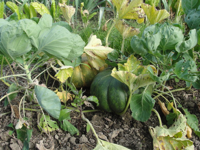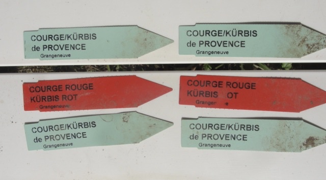 ... des Courges de Provence (Perso je préfèrerais insister sur Musquée) et des Courges rouges (Remarquez le sens poétique de la dénomination !!) . Les seules dont le semis a réussi sont les deux intruses sur la photo de famille: Flat white Boer (qui me fait penser à l'Afrique du sud) et Hokkaïdo rouge qui vous fait penser au Japon, non ?