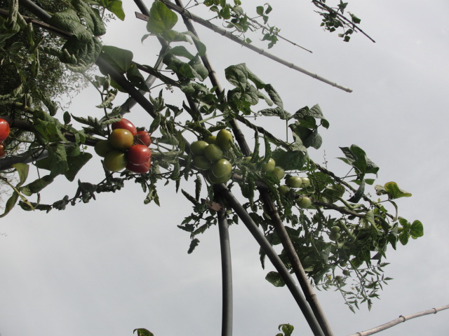 ils ont produit jusqu'à 3 m de hauteur un bon contingent de tomates - ce sont des variétés à tolérance exceptionnelle (Rondobella, Matina) qui ne craignent pas la météo maussade (un mot insuffisamment fort mais bien visible sur la photo).