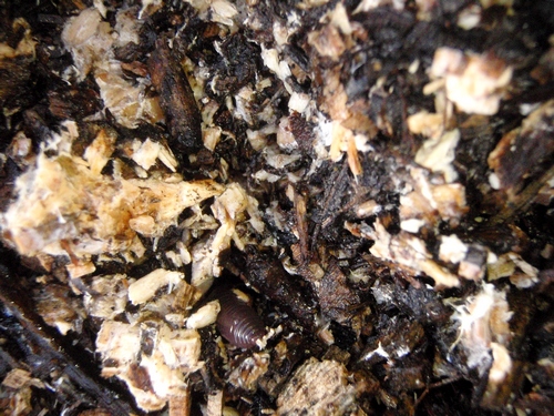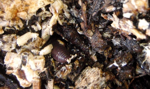 Pas un ver de terre, pas un insecte. J'ai seulement trouvé une noix, peut-être apportée par un lérot. Les feuilles, que j'ai étalées le 26 novembre, cmmencent en-dessous à se désintégrer très lentement.