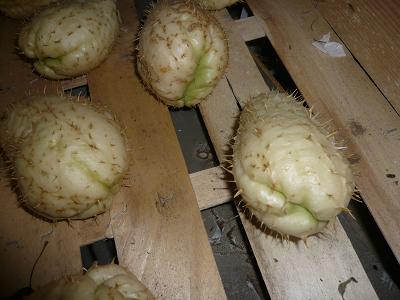 Ce qu'il te faut faire (à mon avis ... d'autres confirmeront) avec les fruits qui ont démarré est tout simplement de les mettre en terre, dans des pots assez grands (autour de 20 à 25 cm de diamètre et de haut) remplis de moitié terre de jardin, moitié terreau (le cul qui fait les pousses en bas et à moitié enterré)