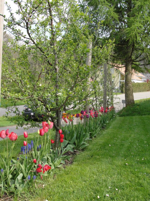 Une allée de 4 fruitiers palissés sur lit de tulipes