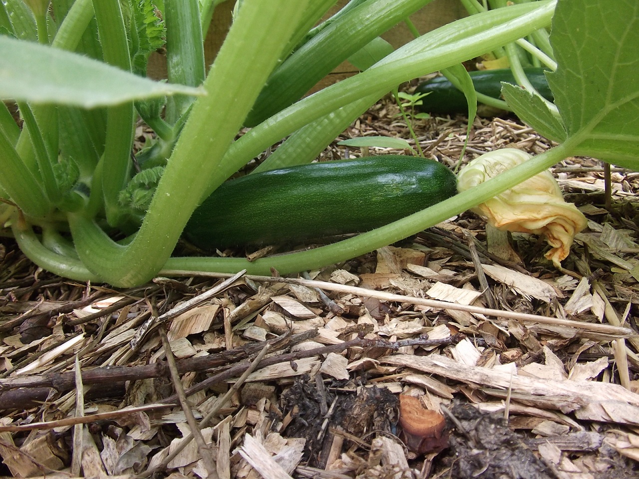 Mes courgettes qui poussent bien. Il y en a d'autres plus petites mais bien formées.
