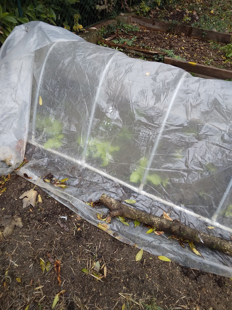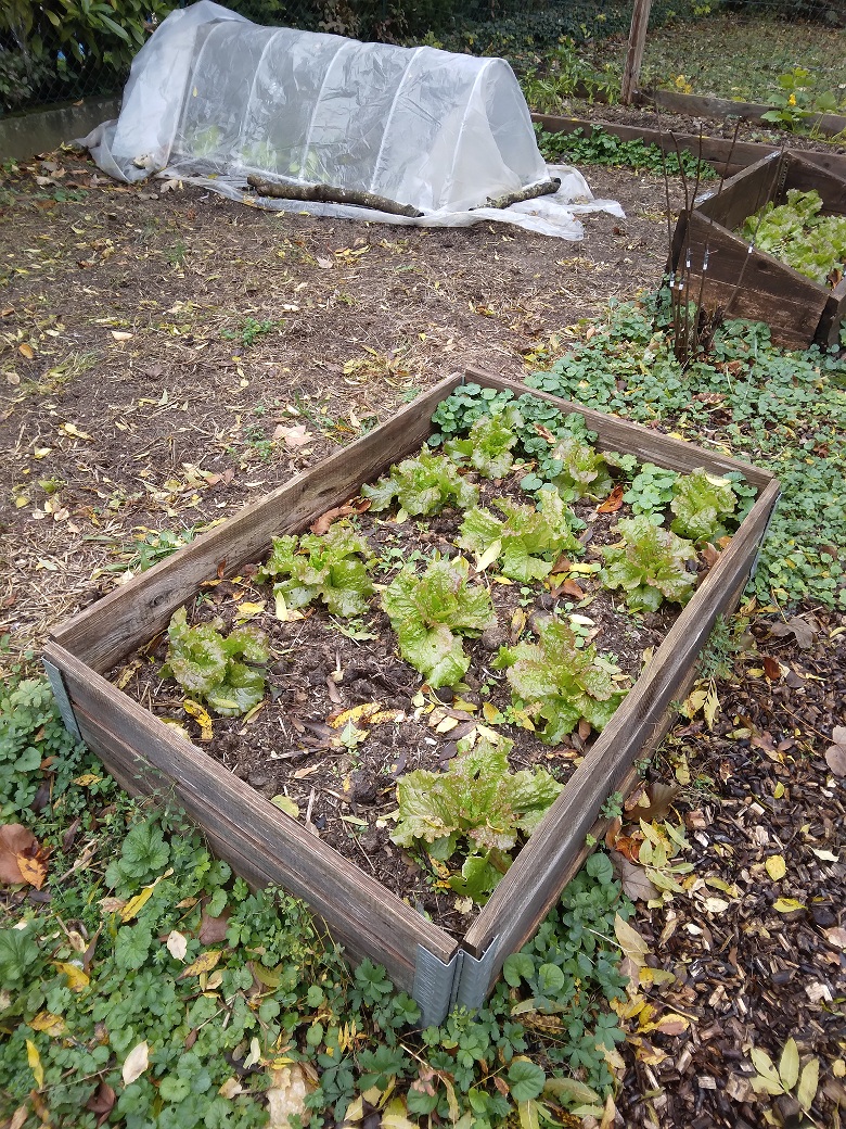 Et puis il y a les salades. Grenobloise et Attraction. Ca pousse tranquillement dont certaines sous tunnel ou cloches. (30) J'ai récolté 3 potimarrons et une butternut. Pour une première, c'est pas mal.