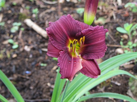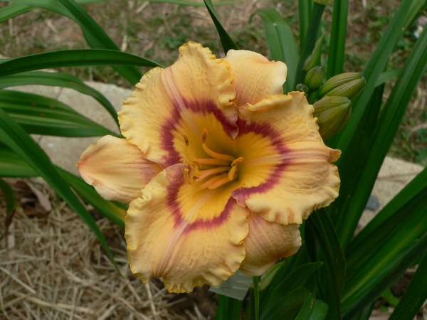 J'ai acheté en mars Entrapment, plantée en avril. D'après la description et la photo du catalogue, elle est d'un "bleu lavande lumineux avec médianes claires". J'attendais avec impatience la floraison. Or voilà mon hémérocalle, qui s'est ouverte ce matin ...