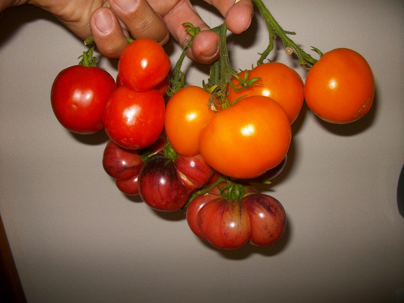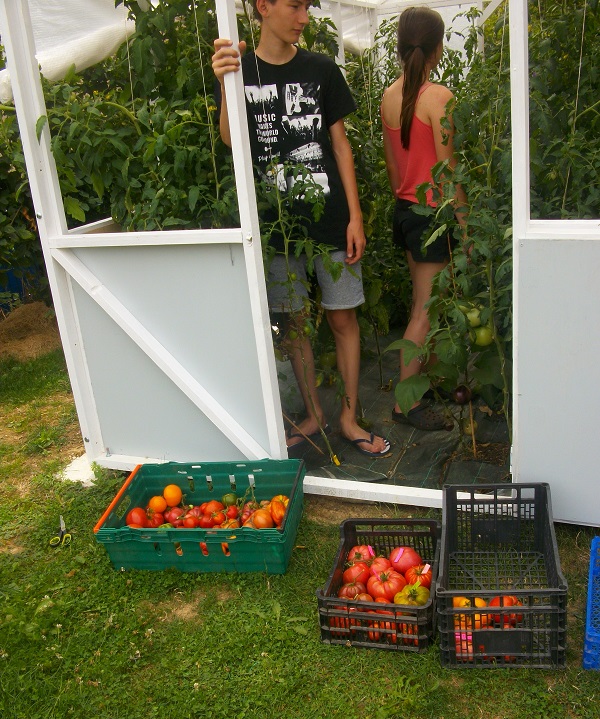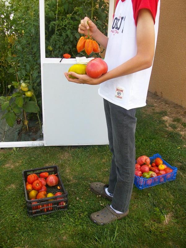 petite récolte avec ma sœurette Johanna ( c'est elle qui repéra la mutation de Surpriz à Bâgé , d'où la tomate Johanna) j'aime bien la technique d'équilibrage des bouquets, que papou me donne, ça mûrit tout en même temps ! voila c'est juste pour dire que ça fonctionnent les techniques de papa. Il sait plein de choses