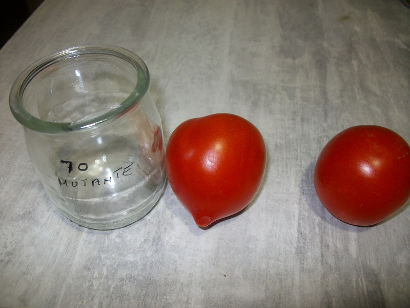 papa m'explique très bien la sélection. Il m'a fait remarqué une mutation, issue d'hybridation accidentelle, sur un plant de déterminée. droite le fruit normal! gauche , en pointe la mutante. Donc on ne garde que le fruit de gauche,puisque toute descendance issue du plants seront , en principe, hybride.