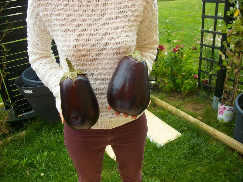 superbe plant , très productif, tomate rouge rayée, en bouquet de 5 à 8 fruits, 2 m de haut. mi saison. en coupe une énorme surprise dans la serre , papa avait semé différentes variétés d'aubergines