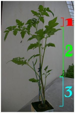 la tête, ou apex. c' est la partie qui recoit le plus de lumière, et qui travaille le plus au niveau de la pousse d' un plant de tomate.
