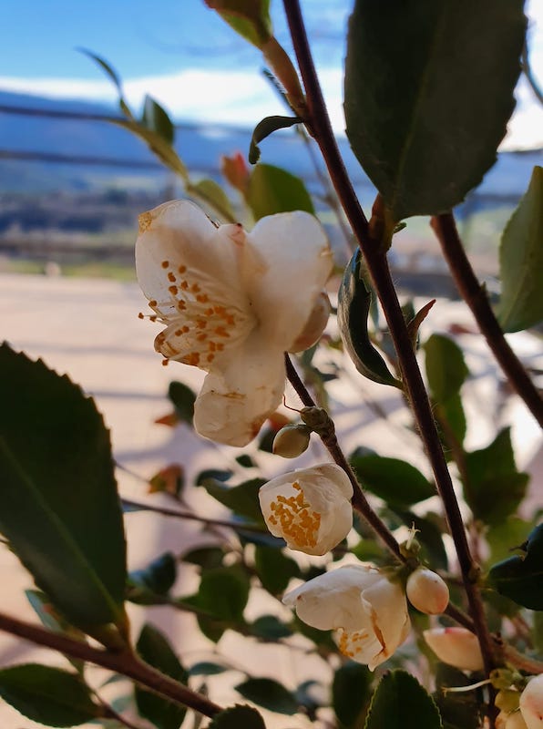 Une photo des fleurs de mon Camellia dernièrement acheté pour nous faire patienter jusqu'au printemps