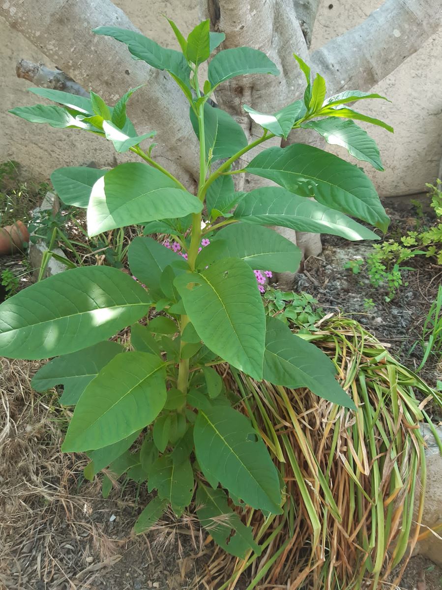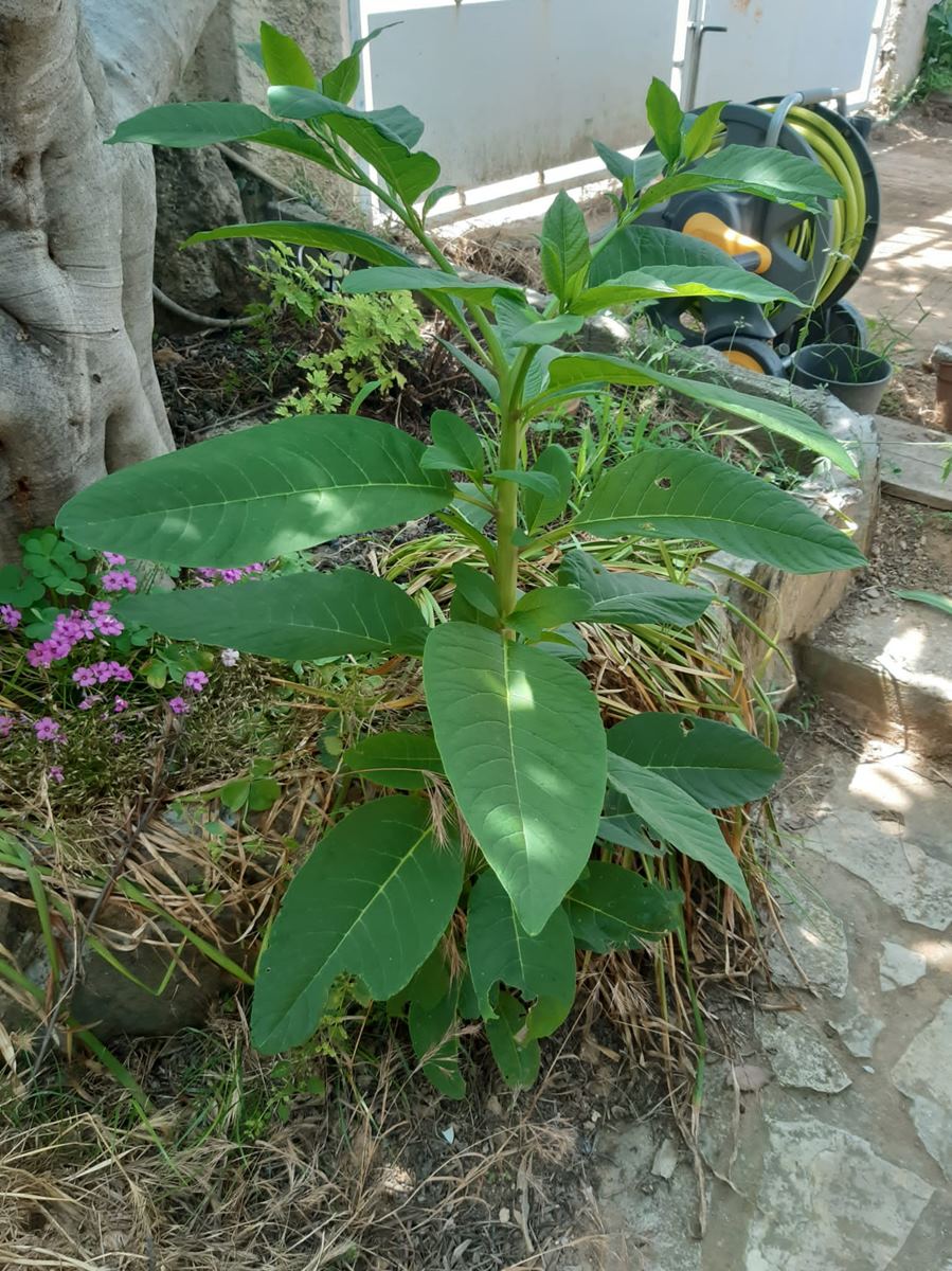 2 photos d'une plante qui a poussé dans mon jardin. Grandes feuilles vertes sans fleurs (pour l'instant ?). Mesure environ 90 cm de haut.