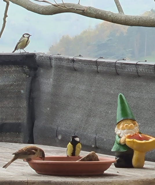 on a acheté un gros sac de graines pour les oiseaux , il y a beaucoup de moineaux , de tourterelles , pas trop de mésanges cette année .