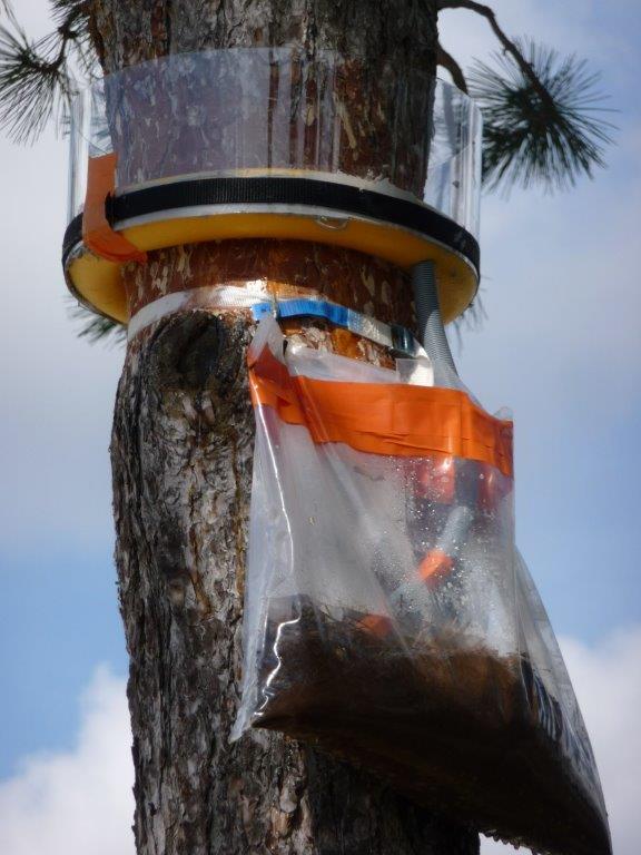 Sous le piège j'ai pendu un sac ( fait avec du plastique épais dans lequel j'ai mis 2 œillets ) à une autre sangle, j'ai rempli à moitié le sac de terre récupérée sous les pins et j'ai mis le tuyau dans le sac. J'ai scotché le sac pour le refermer.