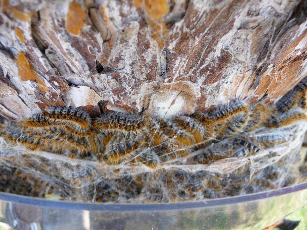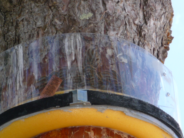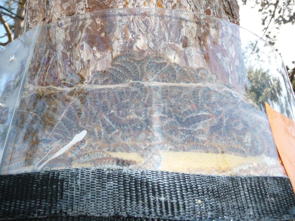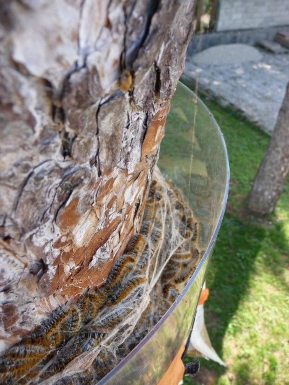 Celle que tu vois sous le piège fait partie des quelques spécimens qui remontent ( elle a dû tomber de l'arbre la nuit dernière pendant quelle dévorait les aiguilles et cherche à remonter dans le nid ), voir ma première question sur ce sujet.