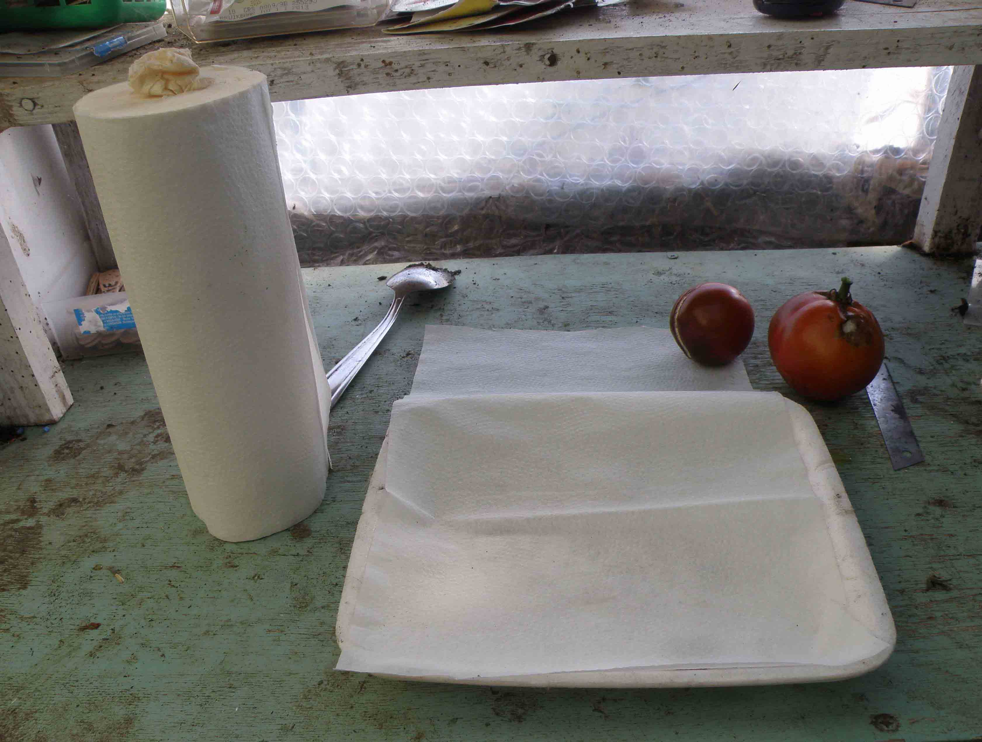 Les graines sont réparties sur le papier (photo 3) et mises à sécher au soleil (photo 4) Il n'y a plus qu'à ranger les barquettes jusqu'à mi-février (photo 5). Ensuite ? Quelques cm de terreau dans une boite (par exemple de glace), humidifier, poser le sopalin directement sur la terre, 1 cm de terre par-dessus, et ça germe sans problème quand on maintient humide, dans un délai de 3 semaines. Si vous laissez le couvercle sur la boîte, c'est une mini-serre, c'est plus rapide.(photo 6) Cordialement