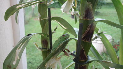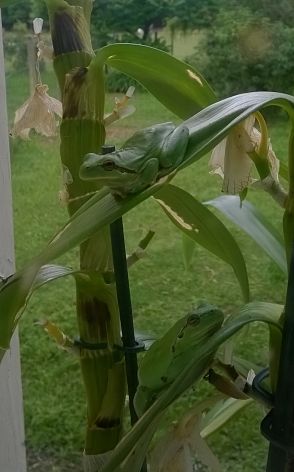 Je vous joins qq fotos des rainettes chez mes parents en Charente. Elles peuvent être jusqu'a 6 sur ce rebord de fenêtre, cachées sur le feuillage et les arêtes des volets, immobiles toutes la journée à attendre patiemment le repas du soir.