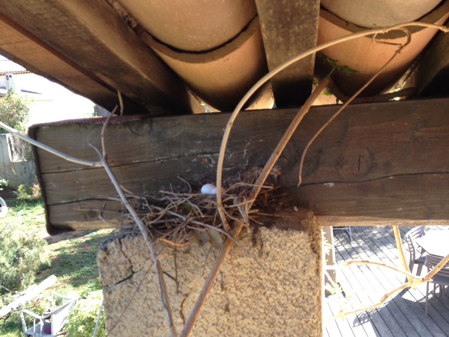 Bonjour, pour la 2° année consécutive, la tourterelle est venue pondre 2 oeufs et les couver sur le pilier du auvent...cette année, c'était pratique, nous avions laissé le nid en place....l'an dernier nous avons assisté à la leçon pour l'envol des 2 bébés........Et même le chien respecte cette présence....