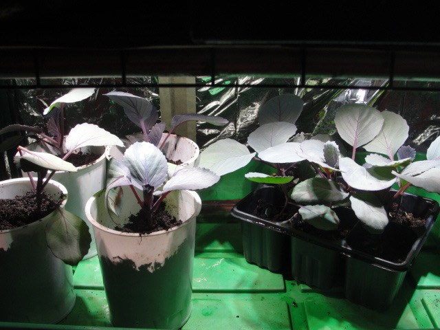 Ces choux rouges semés le 4 février commençaient à être à l'étroit dans leurs barquettes de 6 alvéoles et commençaient à manifester un manque de nourriture - le terreau à semis n'est qu'un support pour 1 mois de couvaison, après il faut un terreau nutritif.