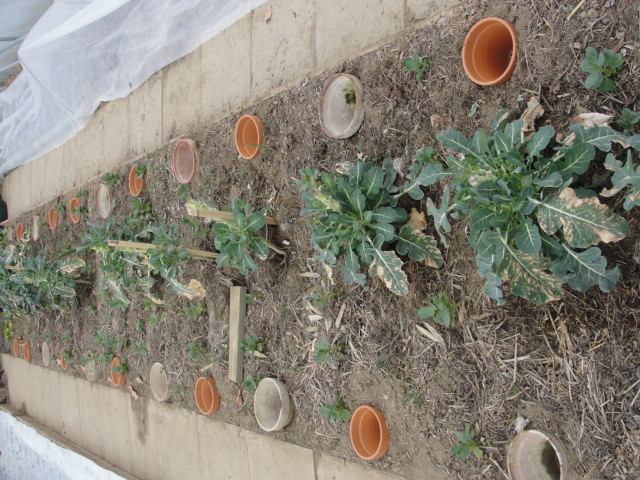 Aujourd'hui solution 3 : augmenter le nombre de pots en terre cuite destinés à l'arrosage des tomates.