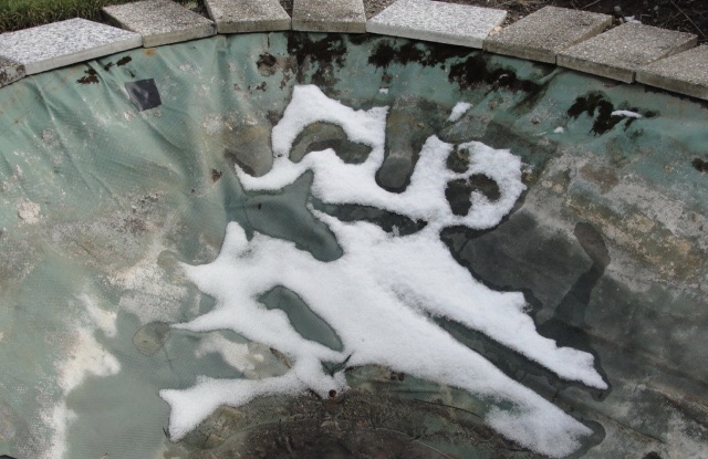 Il y avait tôt ce matin 12 mm dans le pluviomètre dont un tiers sous forme de neige glacée et, en cadeau, une oeuvre d'art picturale dans l'étang (toujours en reconstruction !)