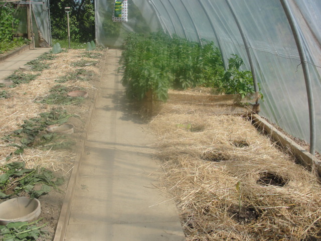 au centre: un EV fauché + broyé le 6 mai, mis en couverture avec des orties entre les tomatiers plantés le 29 mai