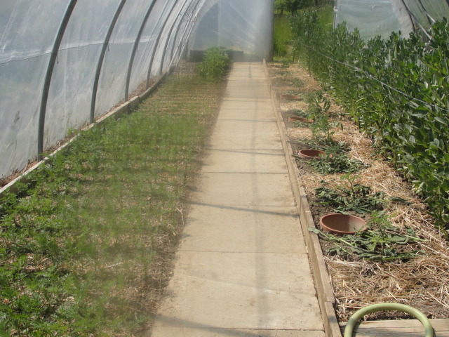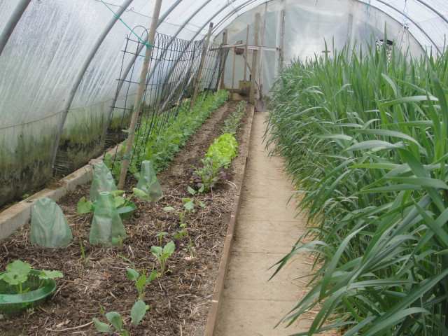 Je me suis préparé pour leur retour: affûtage du couteau qui multiplie par deux et surtout j'ai enlevé les couvertures de foin. Je me suis rendu compte que les limaces y trouvaient gite et couvert. Si les couvertures végétales me semblent indispensables dans le tunnel, elles ne le sont pas autant en PT.