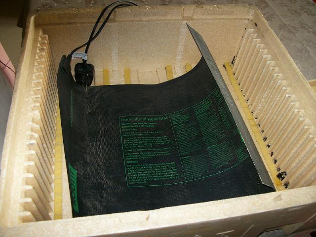 placer le tapis chauffant: le cable ressort bien dans un angle, et, je découpe légèrement pour que le couvercle ferme bien. je dispose les godes et la plaque il n'y a plus qu'à attendre la germination, sous une chaleur douce et humidité adéquate! @+