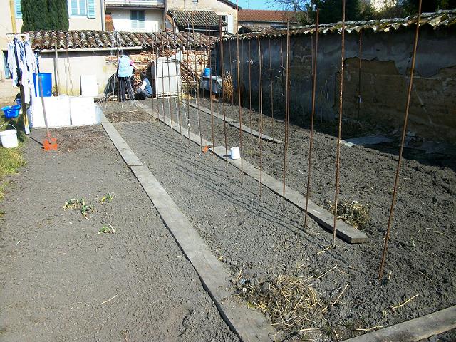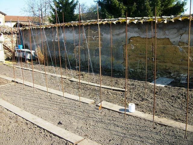 on a finis les emplacements et commencé les piquets. avec le fil pour tailler à 2 tiges les tomates.