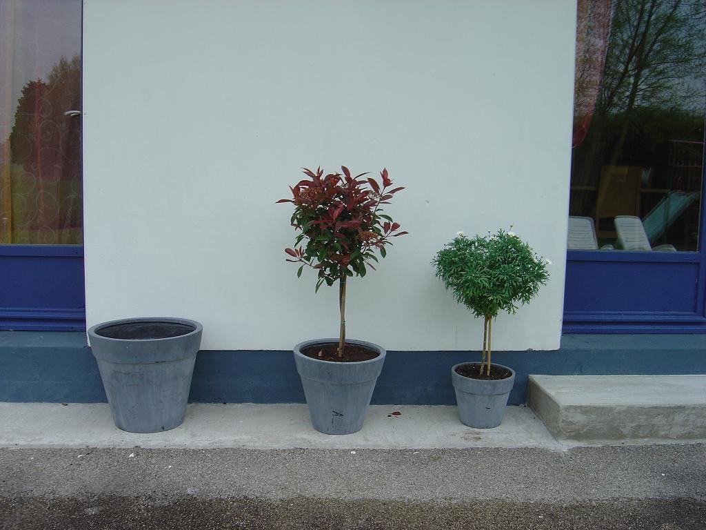 Dans le second un Photinia sur tige d'après le vendeur très résistant l'hiver,garde un feuillage vert l'hiver et dés le printemps des feuilles rouges et des fleurs blanches apparaissent.