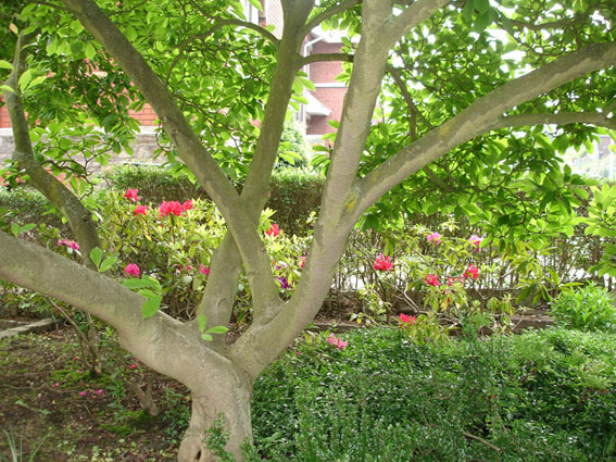 Les rhododendrons ne sont pas tout à fait en dessous du Magnolia