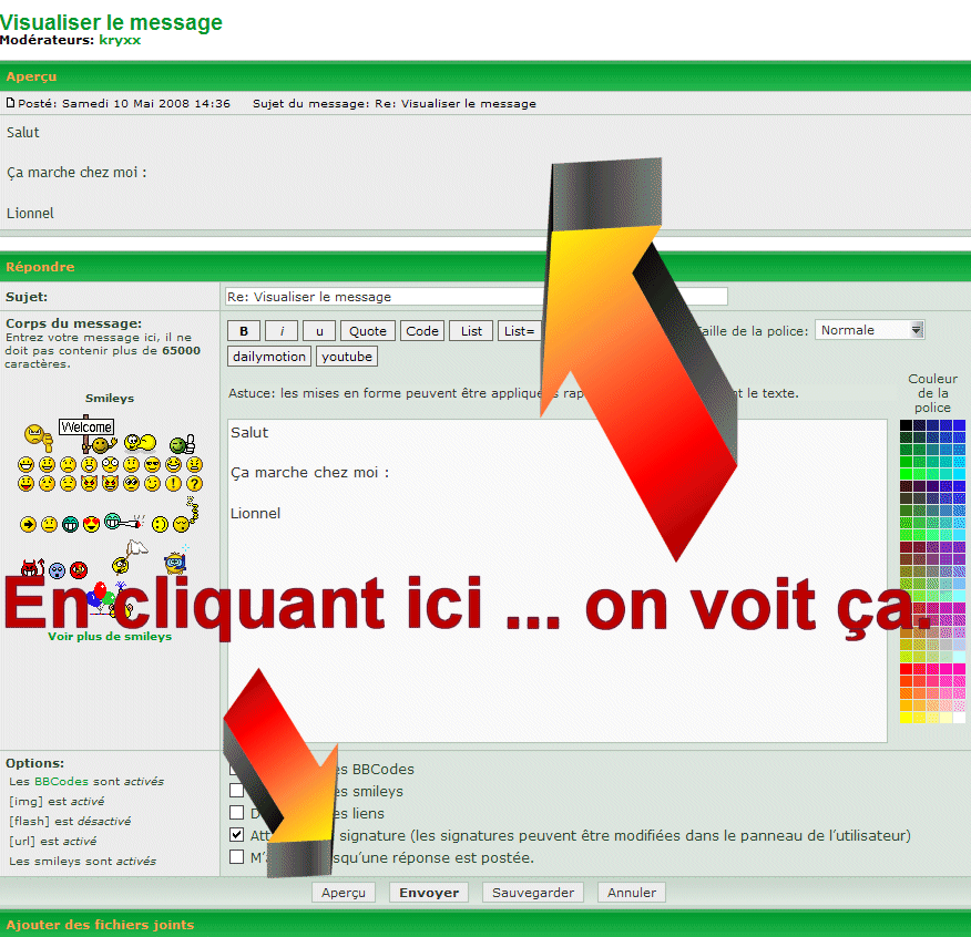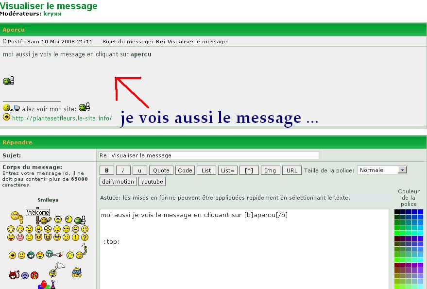 Merci si vous pouvez m'aider, je n'arrive pas à voir le message avant de l'envoyer, lorsque je clique sur aperçu le message ne reste pas affiché :?: