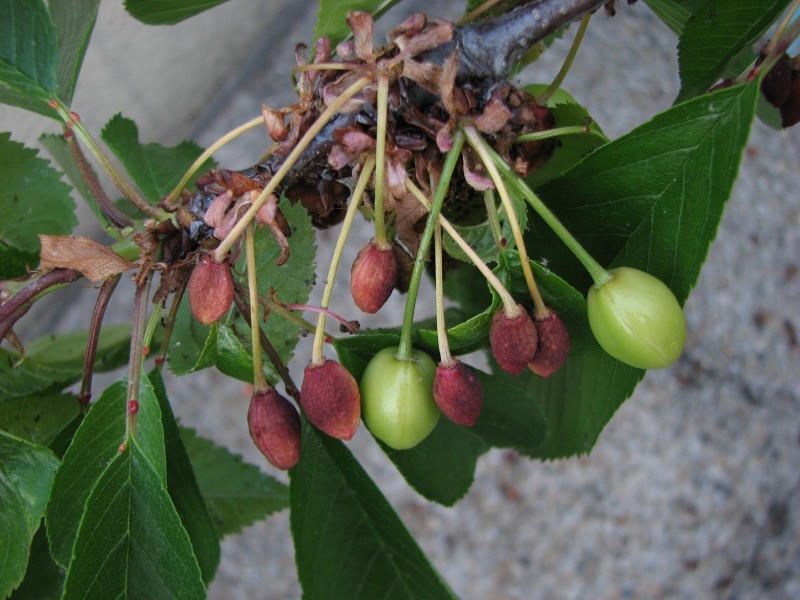 De mon côté je n'aurai quasiment pas de cerises. J'ai vu une centaine de fleurs sur mon cerisier nain, mais à part une dizaine de cerises en cours de développement le reste a avorté (les deux figurent sur la photo). Apparemment il a fait trop humide (pluie) et froid (limite gel) au mauvais moment et les fleurs ont "filé". Snif aussi