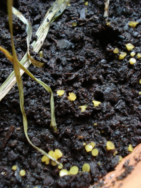 Au jourd'hui, j'ai des petits champignons jaunes qui poussent sur le terreau,