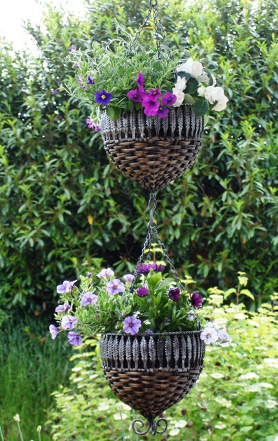 Pour ta suspension, je te conseille, une plante retombante fleurie, un plante verte á feuillage panaché (lierre ou glechoma....) et une plante droite afin de donner du relief á ta composition.