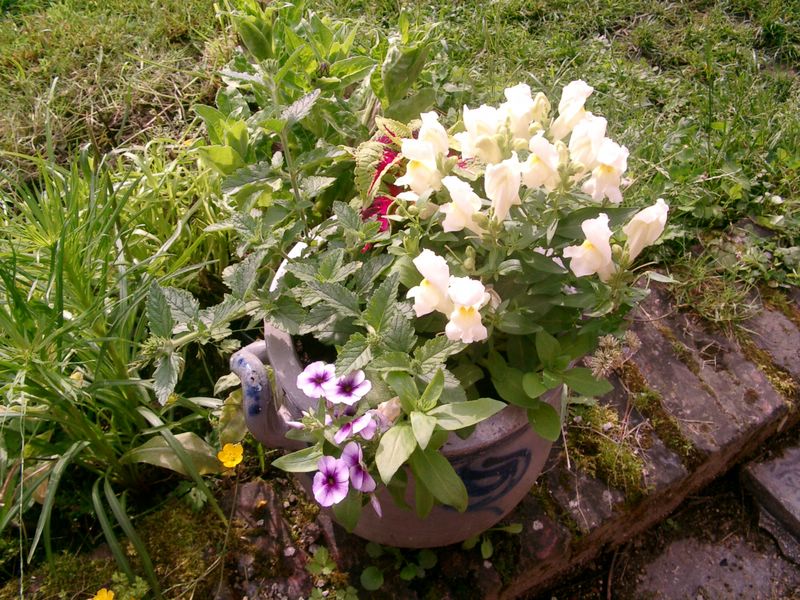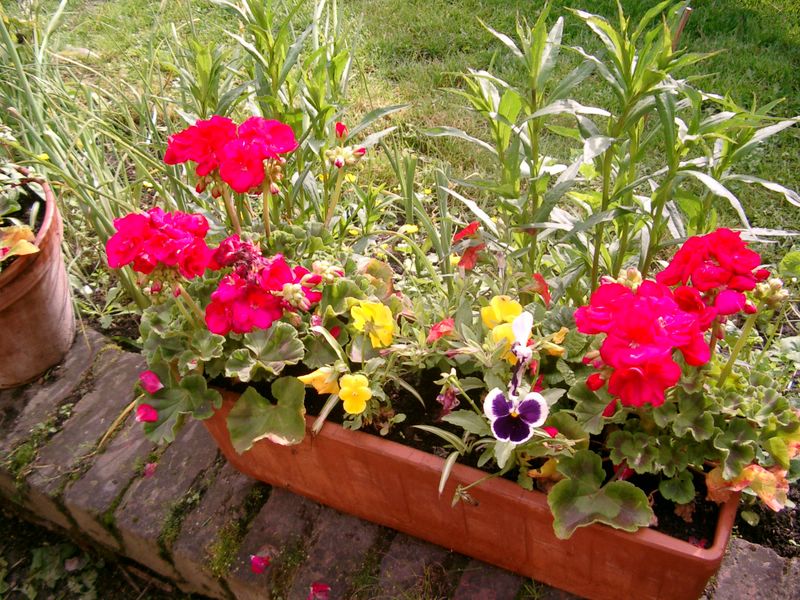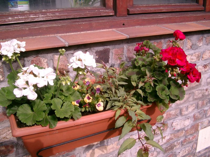 Je n'ai pas de balcon ni de terrasse mais des appuis de fenêtres et un muret qui fait tout le tour du jardin sur lequel j'aligne mes pots, ca fait une double rangée de fleurs, le parterre et les potées....