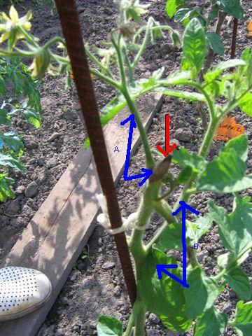 en rouge, je coupe la partie malade,après avoir eu un ouveau gourmant sain, en vert! dans le carré jaune de petites tomates :wink: