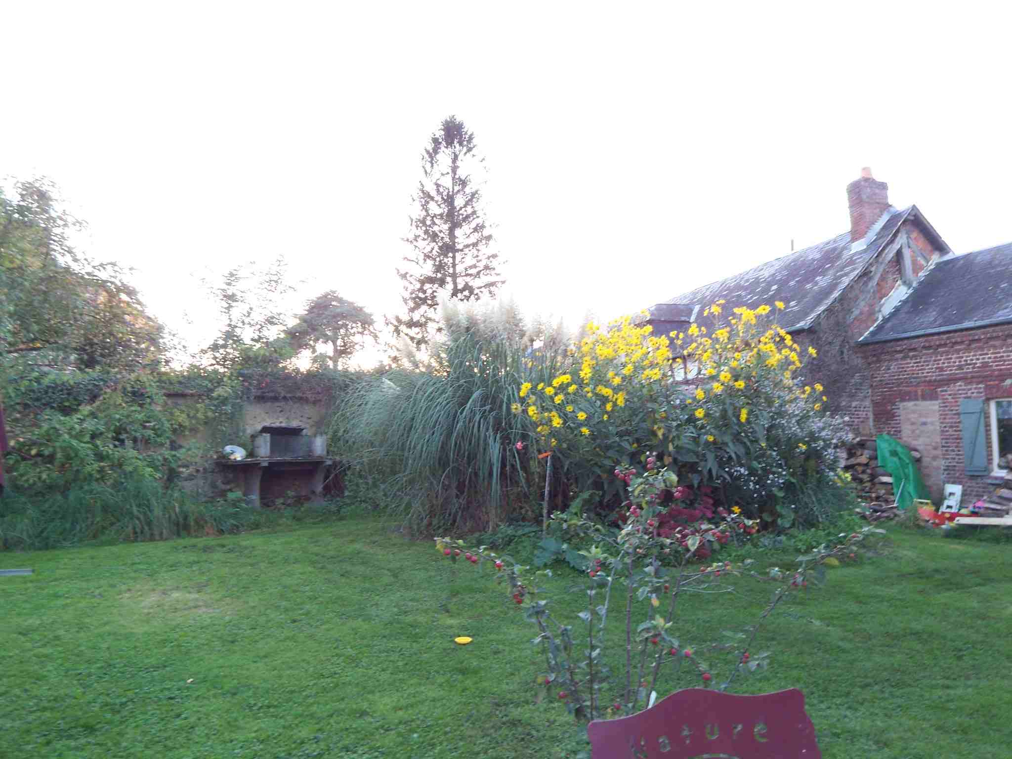 en fait ça c'est fait presque par hasard: qd nous sommes arrivés en juillet 2005, nous avons du nous intaller ds une maison presque insalubre, nous n'avions dc pas de place ds la maison pour stocker puisqu'il fallait passer l'été aux travaux d'urgence.... on a dc posé des placos par terre et posé dessus des cartons avec tt ce qui ne rentrait pas ds le cellier et la maison, le tout recouvert d'une bâche de chantier en plastique.... une idée détestable: avec l'humidité et les souris on a quasi tt perdu mais bon...un an plus tard seulement on retirait les cartons et on se retrouvait avec un grd espace sans herbe au pied de la pampa... mon fils m'a tt bêché (sans tomber sur aucune racine de la pampa, ça doit descendre tt droit et profond je suppose..) et j'ai semé un mélange de coquelicots et de graminées