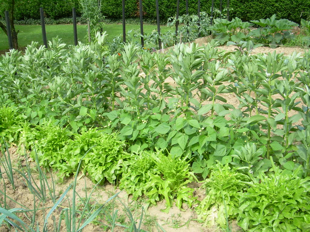 Entre autre, ils disent qu'il ne faut pas mettre de la salade avant ou après des haricots!J'en mets systématiquement, les légumineuses ayant la particularité d'enrichir le sol en azote ce qui convient très bien à la salade. Non seulement je mets de la salade aprés des haricots mais j'en mets même en même temps, côte à côte pour qu'elles profitent de l'azote des haricots. Le résultat? Voilà en photo, plants de radiceta-salade marocaine, merci Aygues31- à côté d'un rang de haricots verts et de fèves. De l'autre côté des fèves il y a des salades romaines encore un peu petites.