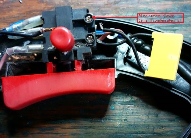 Le fil noir du moteur, passe sous l'interrupteur et se branche avec le 2ème fil du condensateur :
