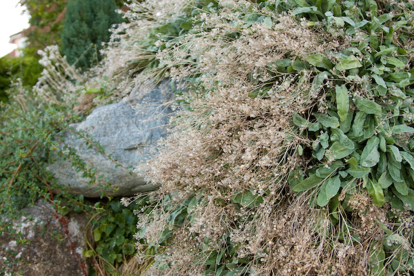 Je vous mets aussi un gros plan de la grosse plante qui est deja installee (aucune idee de ce que c'est). Ca a fait de jolies fleurs jaunes mais, maintenant, c'est tout gris.