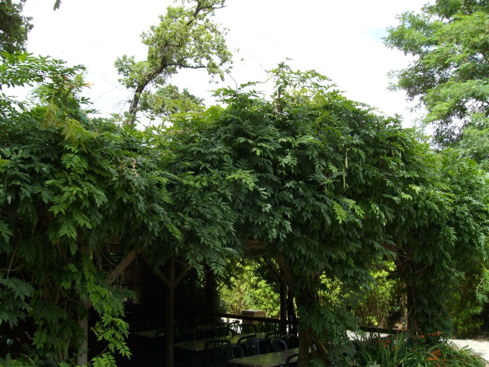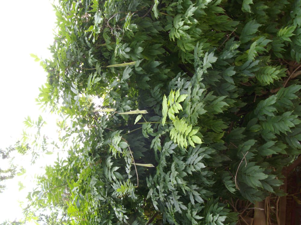 et j'ai même récupérés deux gros récipients de graine de palmiers , bien noire toute prêtes à être semées, j'ai également vu une grimpantes qui n'est pas en fleur actuellement (qui ressemble un peu à la bignogne au niveau du feuillage , et cette plante avait des genre de cosses de graines accroché , j'en ai ramassé qu'une seule cosses , mais je ne sais pas du tout quelle peut être cette grimpante et m'en remet à vous avant de semé quoique ce soit qui ne serait pas bon dans mon jardin .je vous mets une photo de la dite plante grimpante en espérant que vous pourrez m'éclairer. Merci à vous
