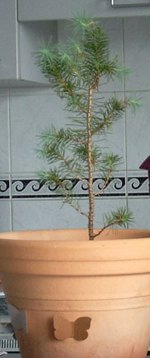 C'est un bébé pin offert lors d'un mariage (si vous cherchez arbre de poune sur google, vous verrez), il y a deux ans. On l'a planté dans un pot pour le garder à l'intérieur (en appartement, c'est quand même plus pratique