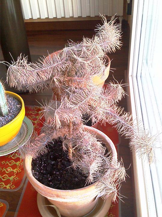 Cet été, nous sommes partis en vacances, nous avions mis une bouteille d'eau percée dans la terre, comme l'année dernière. Or, à priori, l'arbre a manqué de quelque chose (eau ou lumière, je ne sais pas), du coup aujourd'hui il semble "cramé" (les aiguilles sont devenues brunes), et dégage une odeur de bois sec
