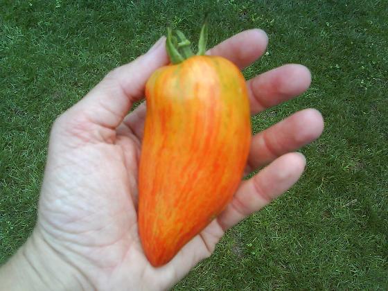 Bonjour, voilà la 1ère tomate que nous avons mangé cette année, une romaine mouchetée. Le reste commence à bien rougir, miam miam!